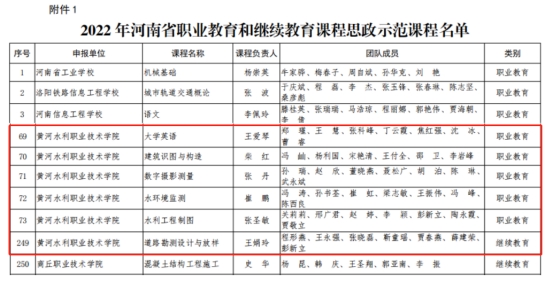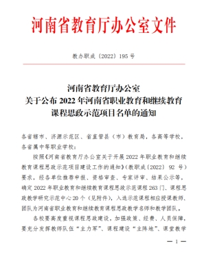 近日,河南省教育厅下发《完美网页版公布 2022 年河南省职业教育和继续教育课程思政示范项目名单的通知》(教办职成〔2022〕195 号),我校《大学英语》《建筑识图与构造》等5门课程入选职业教育课程思政示范项目,《道路勘测设计与放样》课程入选继续教育课程思政示范项目。
