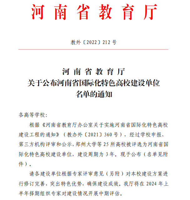 6月28日,河南省教育厅下发《完美网页版公布河南省国际化特色高校建设单位名单的通知》(教外〔2022〕212号),我校成功入选河南省国际化特色高校建设单位。