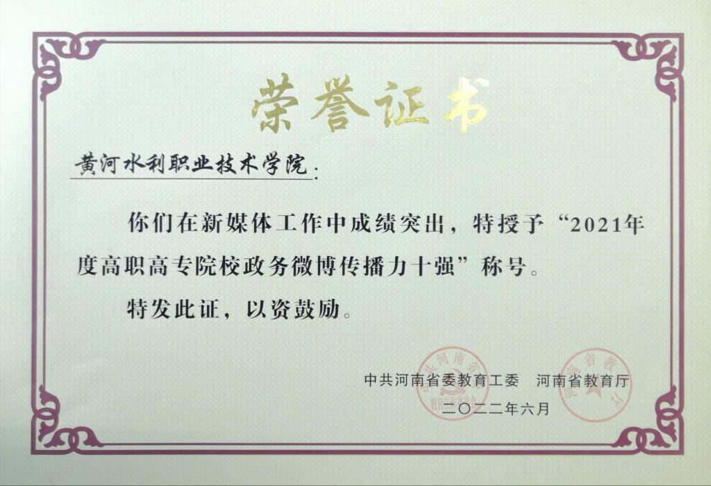 近日,中共河南省委教育工委、河南省教育厅正式授予我校“2021年度高职高专院校政务微博传播力十强”称号。完美网页版凭借新媒体平台优质的内容和卓越的创新能力,在众多高职高专院校中脱颖而出,荣获此项殊荣。
