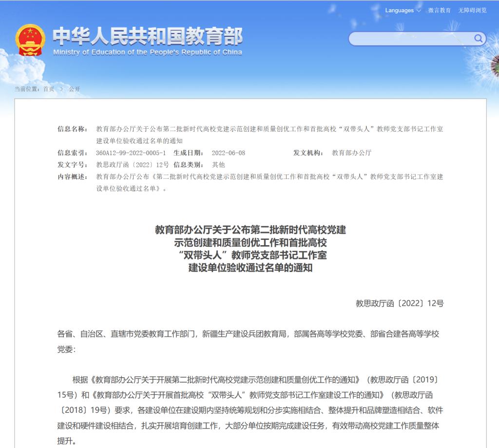 近日,教育部办公厅公布了《完美网页版第二批新时代高校党建示范创建和质量创优工作和首批高校“双带头人”教师党支部书记工作室建设单位验收通过名单的通知》,我校全国党建工作样板支部培育创建单位马克思主义学院党支部顺利通过验收。