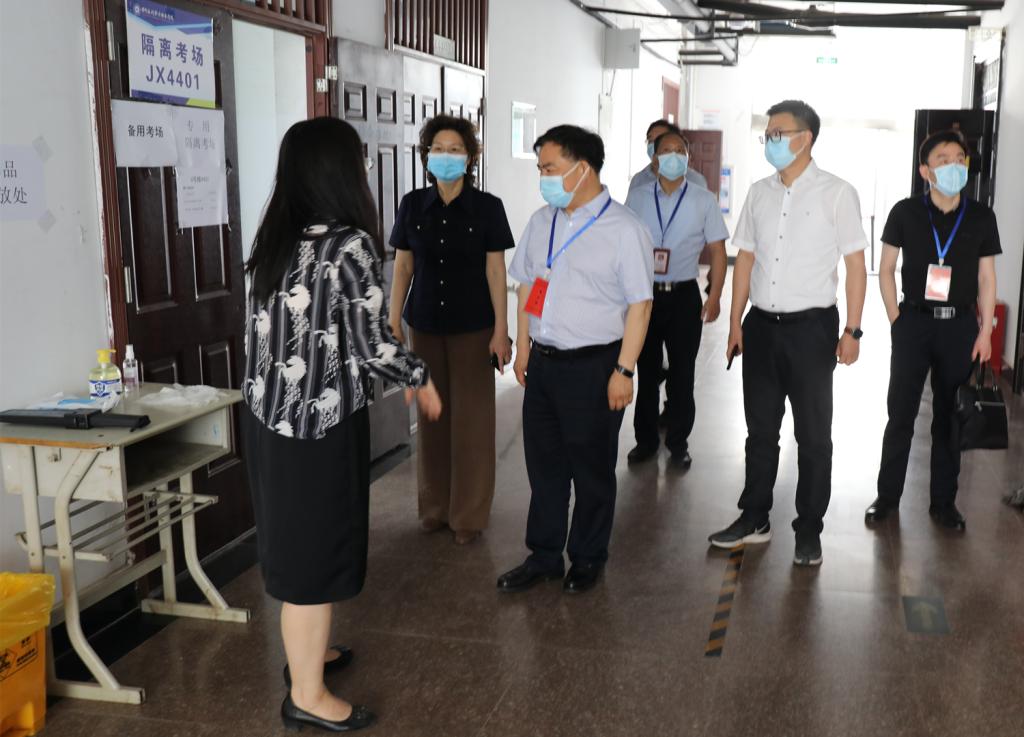 座谈会前,校领导陪同吕冰一行现场查看了标准化考场、备用考场、视频监考室、保密室、督导指挥室、隔离通道等考区和防疫布置。(摄影:党委宣传部 袁洪博)