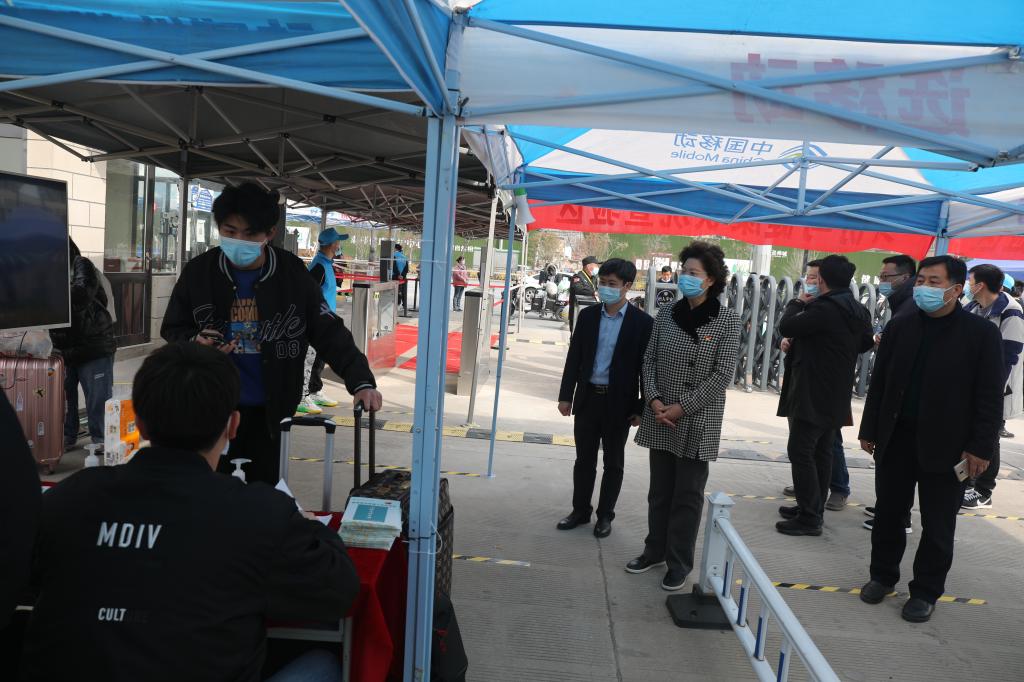 一早,我校返校复学工作人员就已整装上阵。校党委书记周保平带领相关部门负责人来到学生报到点,慰问一线工作人员,指导学生返校复学工作,察看人员管控、进门扫码、体温检测、应急处置措施等各环节工作情况。她与返校学生亲切交谈,详细了解了学子们的假期生活、返校途中的防疫措施等情况,并勉励大家尽快调整心态,以最好的精神面貌迎接新学期的校园生活。校长祝玉华带领相关部门负责人来到学生食堂察看了相关准备工作,对迎接返校复学的后勤保障工作提出了具体要求。
