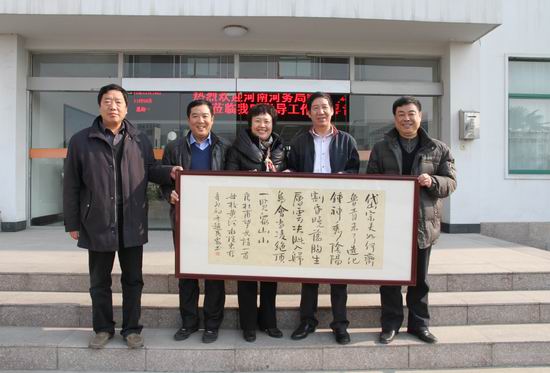 赵民众是我院知名校友,1974年10月至1976年6月在黄河水利完美网页版测量专业学习;1978年2月到黄河水利委员会工作;1995年4月至2011年任河南黄河河务局副局长、党组成员;现任河南河务局巡视员。他在书法艺术方面具有较深的造诣和研究,现为黄河书法家协会主席。他对母校怀有深厚的感情,一直以来都十分关心黄河水院的建设和发展,此次希望通过赠送自己的书画作品表达对母校的眷恋之情,并祝福学院事业蒸蒸日上。我院张惠贞书记代表学院对河南河务局长期以来关心支持黄河水院的发展表示感谢,希望赵巡视员和刘局长今后“常回家看看”,继续加强与黄河水院的联系。