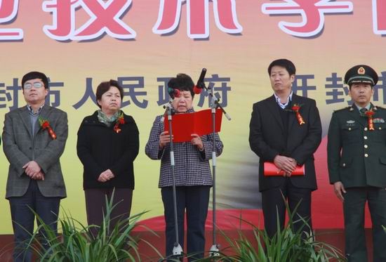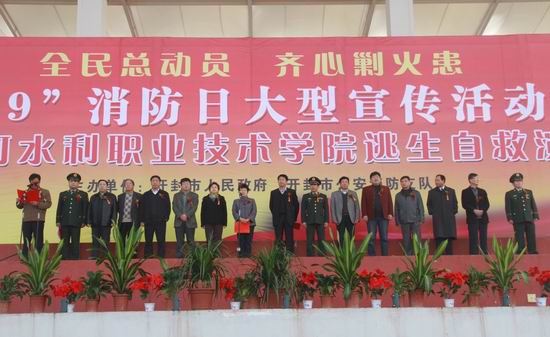 11月9日是第21个全国消防宣传日,开封市“119”消防日大型宣传活动启动仪式暨黄河水院逃生自救演习活动在我院祥云体育场隆重举行。开封市委常委、市政法委书记蒋美兰,市政府副市长、开封市公安局局长刘玉虎,开封军分区副司令员侯敬民,黄河水利职业技术学院院长刘国际、副院长茹正波等领导出席仪式。城区消防安全重点单位的负责同志、消防志愿者、社会各界群众及我院师生5000余人参加启动仪式。仪式由市政府副秘书长侯潮主持。