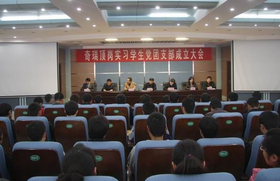 奇瑞顶岗实习党支部书记李振磊和奇瑞顶岗实习团总支书记韦春江分别代表学生党支部和团支部发言,表示将不辜负学院重托,团结全体党团员和积极分子同心协力,组成作风硬朗、思想活跃的基层党团组织,以高度的责任感认真完成学院、企业交办的任务,为学院争光,为奇瑞添彩。