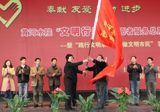 仪式上,黄河水院“文明行动”志愿者服务总队秘书长、院团委书记周志琦首先宣读了志愿者服务总队章程的主要内容。随后,院党委书记张惠贞向“文明行动”志愿者服务总队秘书长周志琦授旗,全场响起热烈的掌声。志愿者服务队代表带领全体志愿者庄严宣誓。