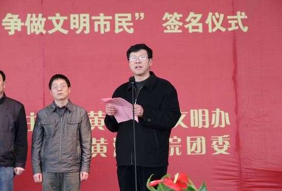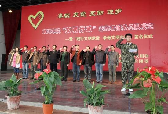 329日,我院“文明行动”志愿者服务总队成立暨“践行文明承诺、争做文明市民”签名仪式在风雨球场隆重举行。院党委书记张惠贞、党委副书记王卫东出席仪式,院宣传部、学工部、团委、水利系、测绘系负责人参加了仪式。仪式由院团委副书记谷献晖主持。