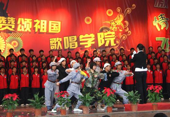 在各系合唱团的展演结束之后,院领导、老师和同学们一起高唱《歌唱祖国》,表达对祖国61岁华诞的深深祝福。