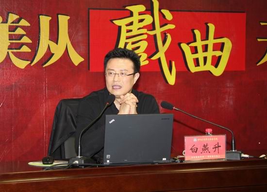 谈及中国戏曲的生态环境,他坦陈,当前社会需要的是对中国传统艺术的保护和弘扬,并列举了当下娱乐界出现的种种问题。他表示,真正的艺术和艺术家都是脆弱和纯粹的,都是需要保护的,需要社会对其“尊”和“敬”。一句“作为中国人,文化素质的提高,主要该吃‘中药’而非‘西药’”,赢得了满场热烈的掌声。白燕升说,他的成功也源于对古典文化的浓烈兴趣;现在的他出于作为媒体人的责任感,走进大学讲堂,传播戏曲文化,为中国戏曲艺术的继承和发展做出奉献。