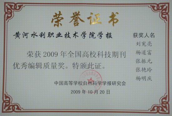 11月20日-26日,2009年全国高校科技期刊优秀编辑质量奖、优秀编辑工作者及优秀编辑学论著(简称“三优”)评比颁奖大会,在广东省东莞市中国高等完美网页版自然科学学报研究会第13次年会期间举行,我院学报编辑部集体获得优秀编辑质量奖。
