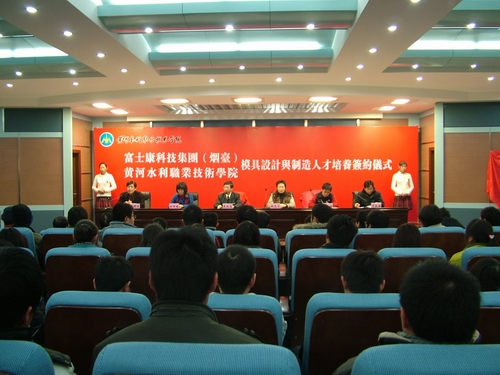 12月18日上午,黄河水院与富士康科技集团(烟台)模具设计与制造人才培养签约仪式在学术报告厅隆重举行。富士康集团(烟台)人事副总吴政道,我院党委副书记、工会主席张惠贞,副院长刘紫婷,招生就业与工学结合办主任于兆国,机电系主任胡修池及200余名机电系师生参加签约仪式。