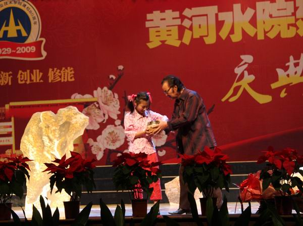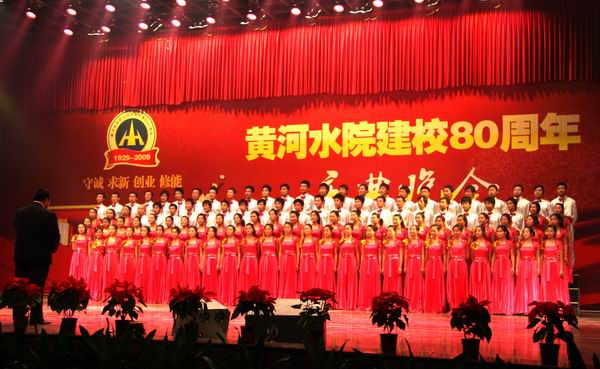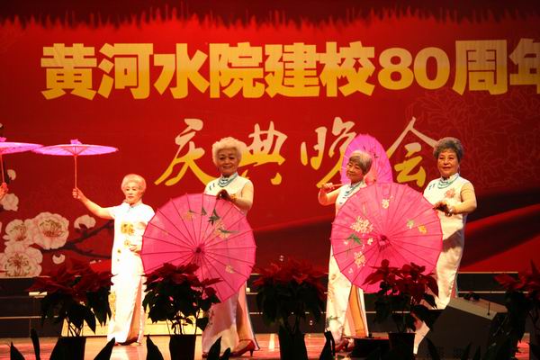 第一篇章《春华秋实》,通过诗朗诵《黄河水院赞歌》、舞蹈《黄河儿女》、女声独唱《报答》等节目,用真诚的语言和饱含深情的表演,表达了广大校友对母校80岁生日深深祝福。国家一级演员、著名笑星范军也应邀来到晚会为我院校庆贺喜,并与我院康禹门老师合说了相声《老歌新歌》,他那诙谐幽默、带有中原文化特点的表演,生动活泼的唱段,引得全场笑声、掌声不断,把现场气氛带向了高潮。小品《水的故事》,则以真实的故事展示了历届黄河水院学子奔赴祖国四方、献身水利事业,舍小家、为大家的感人情怀,引起了在场老校友的共鸣。