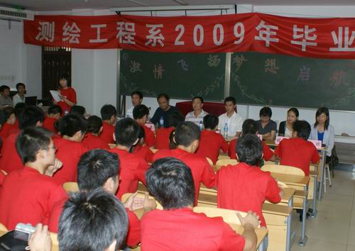 6月12日下午,测绘工程系2009届学生毕业典礼在教学楼6402举行。系党总支书记周建郑、副书记刘广社、系主任赵杰,毕业班辅导员李忠旺、时璐、王崇景以及220余名毕业生代表参加了毕业典礼。学工办主任高琼主持毕业典礼。