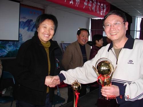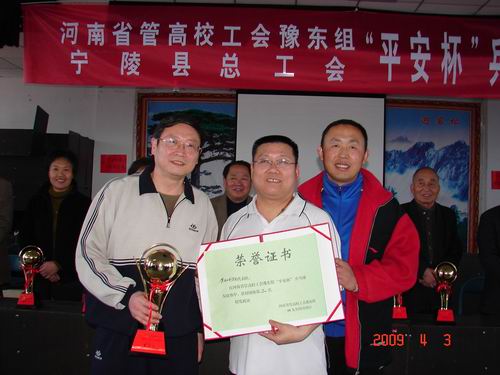 河南省管高校豫东组“平安杯”乒乓球友谊赛于4月3日至4日在宁陵县举行,我院与宁陵县公安局代表队并列第二名。河南大学代表队技高一筹,获得第一名。我院党委副书记、工会主席张惠贞观看了比赛,并为获奖队员颁奖。
