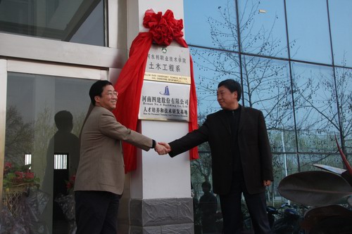 在有关老师的陪同下,黄思亚总经理一行参观了土木工程系的实训场馆。十点整,在鞭炮声中,黄河水院副院长茹正波与四建公司总经理黄思亚共同为河南四建股份有限公司人才培养和技术研发基地揭牌。