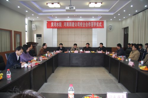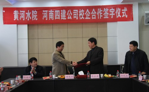 双方校企合作签字仪式在2号实训楼会议室进行。黄河水院副院长茹正波与四建公司总经理黄思亚分别在校企合作协议上签字,标志双方的合作正式开始。随后,双方就实训流程、实训安排以及学生进行顶岗实习时的理论学习安排等情况进行了研讨。