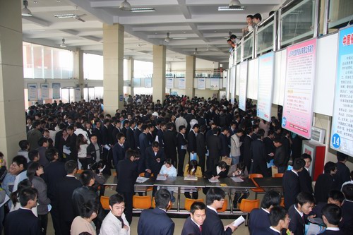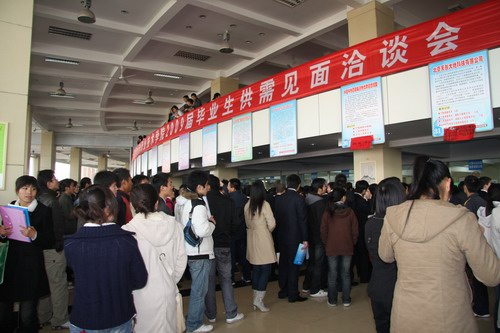 上午9点,洽谈会正式开始。餐厅二楼的招聘大厅人头攒动,热闹非凡。4800多名2009届毕业生忙着把自己精心准备的求职材料和简历递到招聘人员手中,并抓住机会展示自己,希望能够在洽谈会中找到自己施展才华的舞台。本届招聘会共有80余家用人单位参会,共提供水利水电建筑工程、工程测量、机械设计与制造、会计、市场营销等多个专业的工作岗位2000多个。
