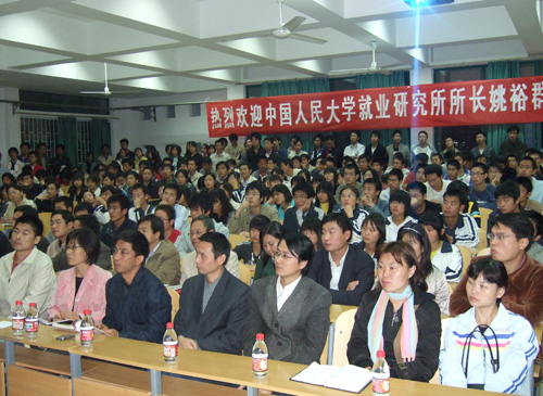 姚裕群教授从我国的经济发展与就业形势、大学生就业难的教育原因等方面分析了大学生就业难问题。针对这些问题,他阐述了解决大学生就业难的对策:(一)塑造全新的高教体制;(二)基于需求进行人才资源生产;(三)就业工作介入教育培养过程;(四)强化大学生就业工作体系;(五)建立就业指导工作体系与测评;(六)深入发掘社会就业岗位;(七)大力提高大学生综合素质;(八)搞好大学生职业生涯指导服务;(九)着力落实大学生创业。姚裕群教授的精彩报告不时赢得师生的热烈掌声。
