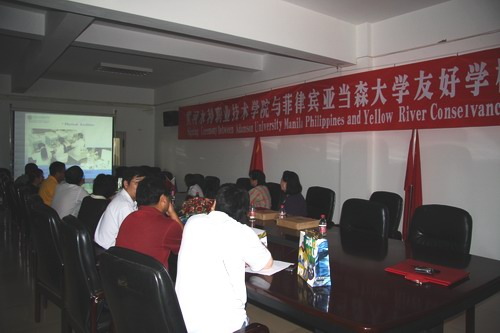 会谈中,菲律宾亚当森大学副院长Ms.Ana Liza Ragos首先介绍了该校的办学条件、师资、学生情况,希望能与我院互相学习、共同发展。我院党委书记、院长刘宪亮对亚当森大学代表的到来表示热烈欢迎,并就我院办学历史、学院环境、开设专业情况进行了详细的介绍。