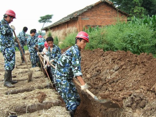 晚上拖着疲惫的身子11点多钟躺下,却难以入睡。我们的营地帐篷周围运送救灾物资的车辆、装载机、汽车、挖掘机的轰鸣声,夹杂着稻田里的蛙鸣,给我们一种“别具一格”的乡土风情。但队员们克服重重困难,仍然每天坚持奋战在抗震救灾第一线的阵地上。
