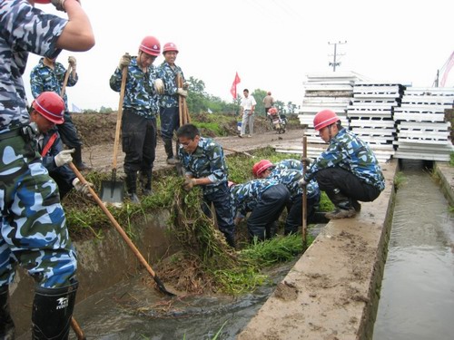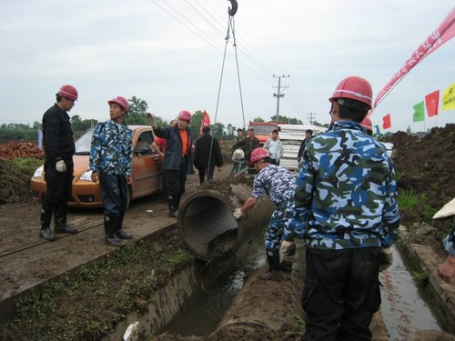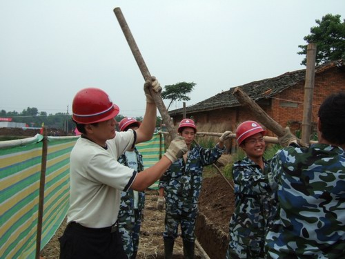 刚进施工现场时天气不是特别热,队员们干劲十足,三个人负责一间房的基础铺设。虽然工作量很大,但队员们个个精神饱满,意气风发,很快就完成了任务。上午刚过8点,灼热的阳光就开始肆无忌惮的炙烤着大地,这种酷热难耐的天气我们很难忍受。在这种情况下或许光着脊背会稍好些,但为防止晒伤队员们工作时都是长袖长裤,衣服全部被汗水浸透,皮肤被太阳炙烤后有灼烧发痛的感觉,热浪一波又一波但我们的队员没有一个叫苦喊累的。在这种艰苦的条件下,但短短一个上午我们就铺设好了15套房的基础。突击队努力的工作得到了中城建筑公司领导和工人们的好评。