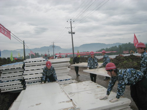 下午配合中诚公司平整过渡房室内地面。天晴了出了太阳,非常闷热,队员的衣服都湿透了。