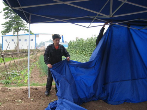 到达工地以后,队长胡修池一声令下,全体队员开始搭建自己住的帐篷。工作开始不久天下起了雨,突击队员冒雨奋战2个多小时,在傍晚7点30分搭起了三顶帐篷,并在抗震救灾的工地上竖起了我们自己的两面旗帜“黄河水院抗震救灾突击队”、“黄河水院抗震救灾众志成城”,此时突击队员已是饥肠辘辘,衣服全湿。之后,队员们在路边小店简单吃了些东西充饥。
