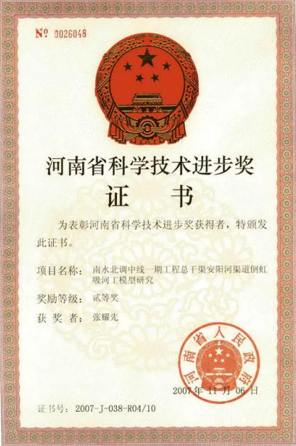 我院与华北水利水电学院联合承担的《南水北调中线一期总干渠安阳河渠道倒虹吸河工模型研究》项目继2007年8月获河南省教育厅科技成果一等奖之后,又获河南省科学技术进步二等奖。获此奖的共10人,其中我院5人,成员为张耀先、罗全胜、王勤香、张宇华、许新庆。