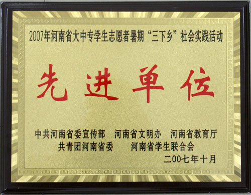 时近年末,又传喜讯:省委宣传部、省文明办、省教育厅、团省委、省学联授予我院“2007年河南省大中专学生暑期“三下乡”社会实践活动先进单位”荣誉称号;开封市委宣传部、团市委、市教育局、市学联授予我院“2007年开封市大中学生暑期社会实践先进单位” 荣誉称号。