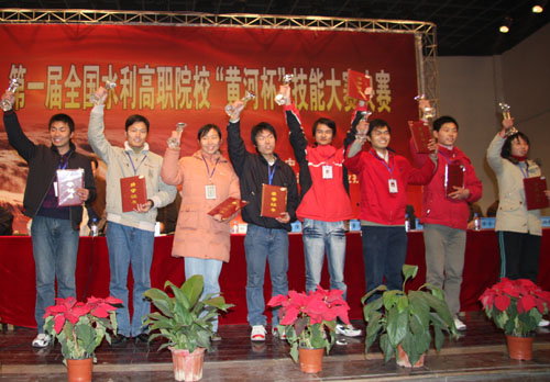 中国水利教学协会副会长彭建明在闭幕式上讲话。他说,本次大赛在中国水利教育协会、教育部水利水电工程专业教指委和黄河水院的精心准备、严密策划下,全国21所高职院校积极参与,取得了圆满成功。众多优秀选手参与比赛,保证了竞赛的质量与水平,展示了水利高职院校学生的技术水平和各院校的教育风采。同时大赛为水利院校互相交流、共同提高提供了平台,希望“黄河杯”技能大赛能够越办越好,成为水利高职院校之间的精品赛事。他还寄语参赛选手要树立“学水利、爱水利、干水利”的信念,为水利现代化建设施展自己的聪明才干。