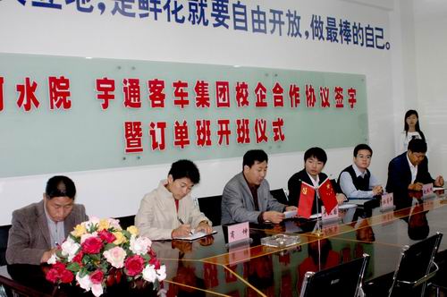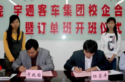 9月29日上午,我院正式与郑州宇通集团有限公司达成定向培养协议,34名学生成为“宇通订单班”首批学员,这是我院在积极探索校企合作、工学结合人才培养模式的又一次重要尝试。