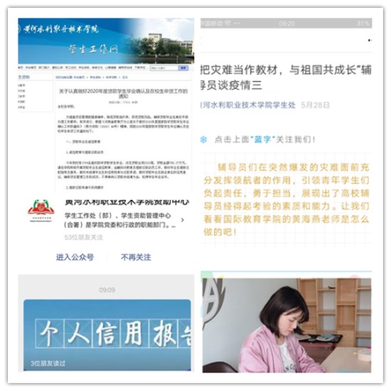 社会即课堂,生活即教育。疫情期间,我校加大资助育人力度,通过完美网页版网站、微信公众号、班级QQ群等进一步宣传国家资助政策,持续推送最美逆行者先进事迹,把灾难当教材、把困难当磨砺,通过一个个感人的故事,对学生进行爱国教育,感恩教育,增强疫情防控期间资助育人的针对性和实效性。培养学生坚韧不拔,敢于担当的品格,引领学生诚信做人。