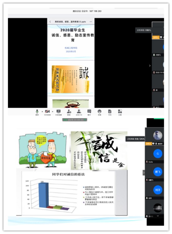 停课不停学,成长不停歇。为做好资助政策“两节课”宣传教育活动,各学院潜心研究网课的使用方法,运用钉钉、腾讯会议、微信群、职教云课堂、QQ班级群等平台,在各种网络平台上开展主题班会、专题讲座等,宣传诚信还贷的意义及个人征信的重要性;对支付宝还款流程、毕业确认、还款变更等资助申请进行详细讲解,普及相关知识,倡导契约精神,进一步增强学生的诚实守信意识,促使学生树立诚信观念,将“诚信”有效地转化为大学生的行为自觉。