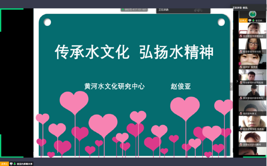 3月22日—28日是第三十三届“中国水周”,为了使学子们进一步了解学习“坚持节水优先,建设幸福河湖”宣传主题和我国水文化,校团委特邀我校马克思主义学院形势与政策教研室主任、黄河水文化研究中心负责人赵俊亚博士做题为“传承水文化 弘扬水精神”的讲座。讲座采取线上集中授课的方式进行,近300名学子齐聚线上,聆听讲座。