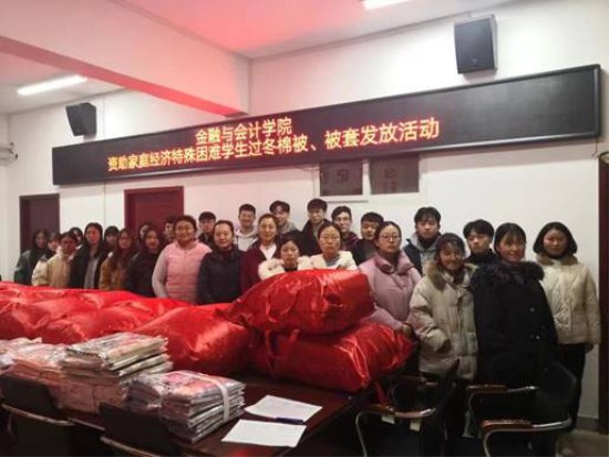 在寒冬来临之际,我校购置被套、棉被各500条,发放到家庭经济困难的学生手中,帮助其温暖过冬。