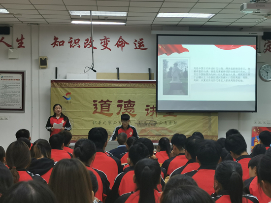 本期道德讲堂分为唱一首歌曲、看一部短片、学一点礼仪、诵一段经典、讲一个故事、做一个承诺、作一番点评、送一份吉祥等八个环节,师生共同感受爱岗敬业的力量。师生齐唱《学习雷锋好榜样》,观看了《最美司机吴斌》的事迹。吴斌坚守自己的工作岗位,认真地履行自己的工作职责,甚至奉献生命,他在平凡的岗位上做出的不平凡的业绩。凡人在基层,小事现生活。“凡人小事”所迸射的力量,最能击中人们心中的最软处,也最能引发道德效仿。《禹三过家门而不入》的故事,深刻诠释了先天下之忧而忧,后天下后天下之乐而乐的大公无私精神。樊建科以《道德照亮人生》为题,为学子们上了一堂内容丰富的礼仪课。他勉励学子们学好本领,淬炼成钢,成为具有社会主义职业道德的人。最后,师生共同做出庄严承诺,并在“爱岗重于才华,敬业在于修德”倡议展板上分享了参加活动的感受。大家纷纷表示要树立爱岗敬业的职业意识,加强自身修养,努力学习,做道德素养高尚的优秀学生。