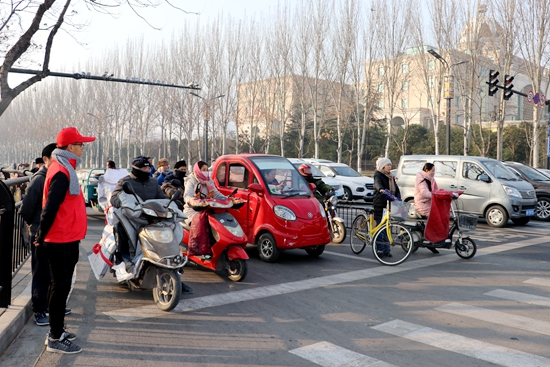培训结束后,志愿者们身着统一服装,冒着严寒站在斑马线旁,有礼貌地对闯红灯、逆向行驶、越线等违法违规的行人和非机动车进行劝导。“现在是红灯,请您稍等。”“您好,请后退,斑马线上不能停车。”……文明交通引导服务工作虽然辛苦,但志愿者们纷纷表示自己的付出使出行更加文明、城市更加和谐,付出都是值得的。在志愿者的积极参与下,有效制止了大部分不文明的交通违法违规行为,促进了城市交通环境改善,他们的身影俨然成了城市一道道靓丽的风景线。我校“小水滴”志愿服务队“文明交通引导”行动也受到交警和开封市民的一致赞扬和高度评价。