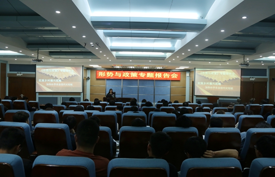4月25日下午,我校在3号实训馆学术报告厅举行了以“实施乡村振兴战略,加快补齐农业现代化短板”为主题的形势与政策专题报告会,近200位师生代表聆听了报告。我校思政部形势与政策教研室朱玮教师为报告会主讲人。