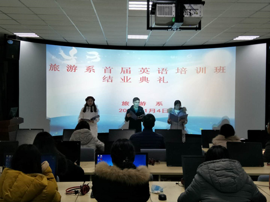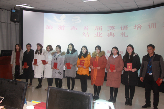1月4日晚,旅游系在5号实训楼102室举行首届英语培训班结业典礼。国际教育学院院长陶永霞、旅游系主任焦红强、酒店管理教研室主任宋莎莎、国际教育学院教师樊庆明以及34名参培学生参加了典礼。
