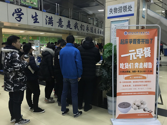 学风建设活动同时还包括“学霸一元吃早餐”奖励活动,以鼓励学生们坚持早起,勤奋学习。自今年11月20日起,每周一早上6:40-7:20,校学生会学习部在完美网页版餐厅43号窗口开展“学霸一元早餐”活动,每周一的前100名用餐学生只需要使用1元钱即可得到4元的早餐。在即将进入的学习月中,校学生会将开展“135”早餐活动,即每周一、三、五,都将为前50名用餐学生提供一元早餐。(供图:团委)