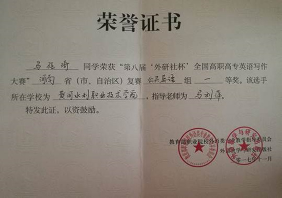 近日,由教育部职业院校外语类专业教学指导委员会和外语教学与研究出版社主办的第八届“外研社杯”全国高职高专英语写作大赛(河南赛区)复赛比赛结果揭晓。我校水利工程学院水文水资源工程专业1602班学生马佳琦获得公共英语组一等奖,指导教师为马利萍老师。