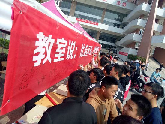 教室是学生学习、生活和交友的涵养之所,近期很多学生将早餐带入教室,将教室变为食堂的趋势越演越烈,影响了学生们的学习和老师的教学。为了树立良好学风,建设优良的学习环境,财经系社联分会于10月27日-28日在扬帆路开展“不带早餐进教室,文明行为我当先”的签字倡议活动。活动向全体学生发起倡议:从我做起,积极践行社会主义核心价值观,争做勤学笃行的优秀大学生;自觉维护教室的环境卫生,不带早餐进教室;以爱护教室环境为己任,自觉清理抽屉和地面垃圾,做一名文明大学生!