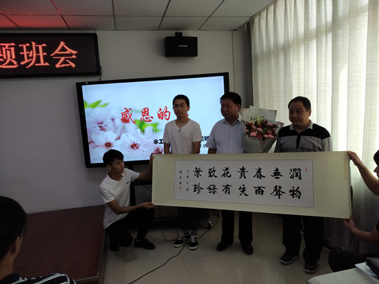 为帮助谭成杰同学学习上不掉队,蒋楷林尽快融入快乐友爱的集体,班级成立了由石伟、闫丰、张牧羽等学生组成的帮扶小组,还向蒋楷林赠送水利工程学院院服。最后,为表达对老师们的敬意,全体学生起立,向老师们深鞠躬,情真意切地道一声:“老师,您辛苦了,谢谢您!”