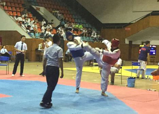我校选手(红方)在激烈的跆拳道竞技比赛中