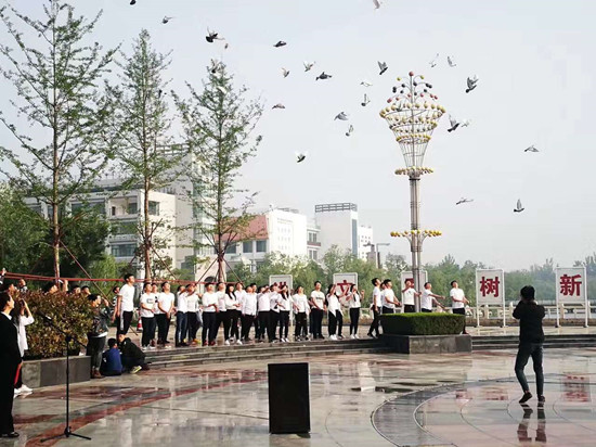 60名团员代表放飞和平鸽,白鸽振翅高飞,表达了学子们为实现梦想努力奋斗的决心。