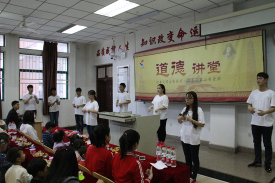 道德讲堂在满天星手语协会带来的手语表演中拉开帷幕。在主持人介绍了活动的目的和意义之后,开封市康复教育中心的老师播放了有关孩子们进行康复训练等内容的视频,并对视频进行讲解,她说,希望以后当人们走到路上,看到这些带有助听器或耳蜗的孩子们时,不要觉得他们有什么不同,其实他们跟常人一样。老师感人的话语表达了她对孩子们深深的爱,也使在场师生对听障儿童的日常学习和生活情况有了一定的了解。随后,市康复教育中心的孩子们朗诵了诗歌《悯农》《静夜思》,演唱了歌曲《找朋友》。孩子们稚嫩的声音、纯真的笑脸感动了在场师生。最后,在主持人的号召下,全体师生高举右手,进行了庄严的宣誓:“理解和尊重每一位听障儿童,面对他们时,设身处地为他们着想,热情帮助他们解决困难,多一份理解,多一份关心。”