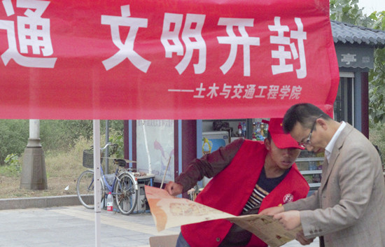 国庆节期间,我校土木与交通工程学院“邢二朋志愿服务队”及其他学生志愿者在该系分团委书记戚亮老师的带领下,身着橘红色志愿者服装,在校门口红绿灯以及东京大道与黄河大街交叉口等处开展“文明交通、服务开封”志愿服务活动,向游客和市民倡导文明出行理念,并为广大市民和游客提供便民服务。