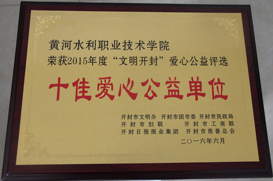 “邮储银行杯”2015年度“文明开封”爱心公益评选活动以“弘扬公益精神、褒奖慈善典型、彰显开封美德、推动爱心事业、助力创文工作”为宗旨,由市精神文明建设指导委员会办公室、共青团开封市委员会、市民政局、市妇女联合会、市工商业联合会、开封日报报业集团、市慈善总会联合主办,开封日报承办。本次评选活动从2016年3月8日正式启动,历时4个月,由《开封日报》、开封网对所有入围提名候选对象进行事迹展示,通过开封日报“掌上开封”微信公众平台进行大众投票。我校在该评选活动中荣获“十佳爱心公益单位”称号,充分彰显了我校师生在爱心公益事业中的社会责任,传播了我校全国文明单位建设成果,提高了我校的社会影响力和社会美誉度。