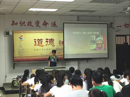 活动分看短片、诵经典、学礼仪、讲故事、唱道德歌曲、作点评、做承诺七个环节进行,重温了2014年“感动中国”年度人物刘盛兰老人的感人故事,诵读了《弟子规》的经典名句。大家齐唱《明天会更好》将活动推向高潮。参加道德讲堂的学生积极发言,交流学习体会。最后杜书记勉励大家要以先进人物为榜样,把友善互助作为个人优秀的品质永远传承下去。