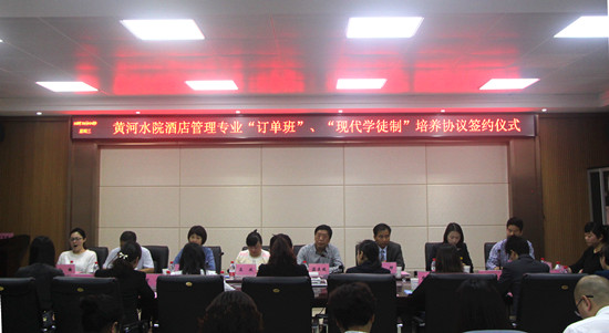 为提升办学品质,提高人才培养质量,坚持不懈地走校企深度合作办学之路,5月5日上午,旅游系旅游系邀请了14家知名品牌酒店的总经理、人力资源总监参加2016年酒店管理专业建设指导委员会议,该系与开封开元名都大酒店、郑州美盛喜来登酒店分别签订“现代学徒制”试点班、“喜达屋订单班”合作协议,这标志着该系在新型人才培养模式探索中迈出了新的一步。